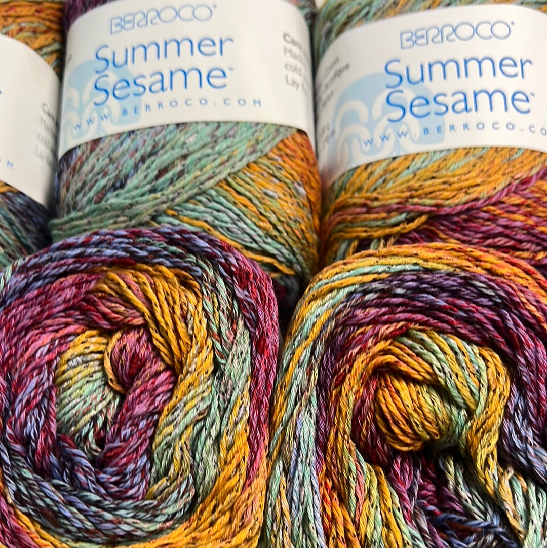 Create fun and colorful tees, tops, and wraps with self-striping Berroco Summer Sesame! This worsted weight cotton and acrylic blend yarn is full of happy shades that change from one to the next effortlessly, adding a delightful touch to your knit and crochet projects. Summer Sesame is machine-washable, making it a great choice for everyday wear items that will brighten your summer.