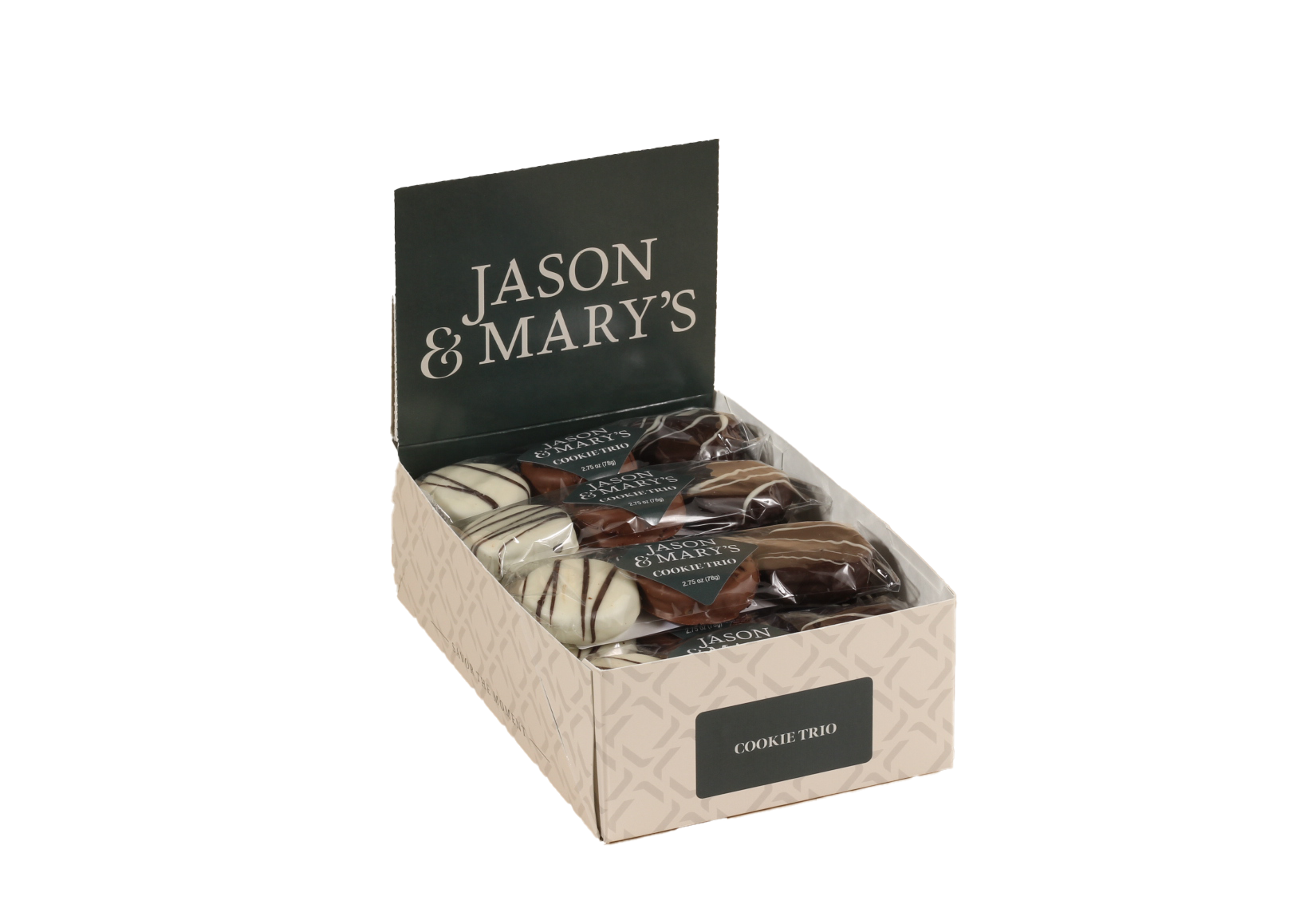 A delicious trio of crispy cookies dipped in smooth milk, rich dark, and creamy white chocolate. A perfect gourmet grab-and-go treat! 2.75 oz.