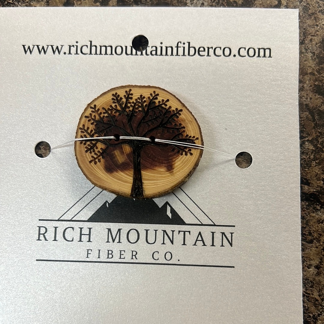 One large wood burned button with tree. Qty 1, 1 3/4 inches.