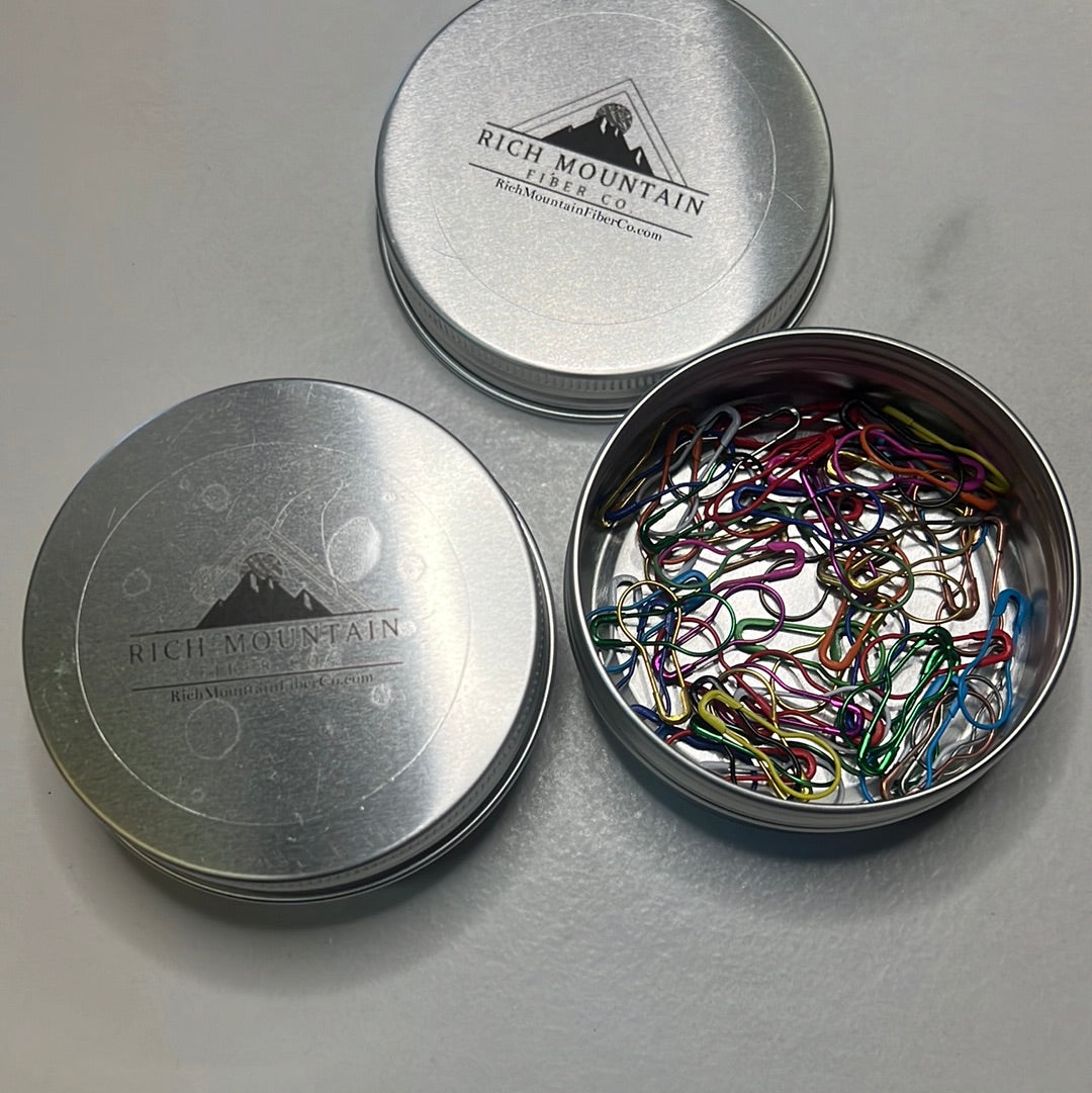 60 multicolor light bulb stitch markers in a silver tin with a twist on top.