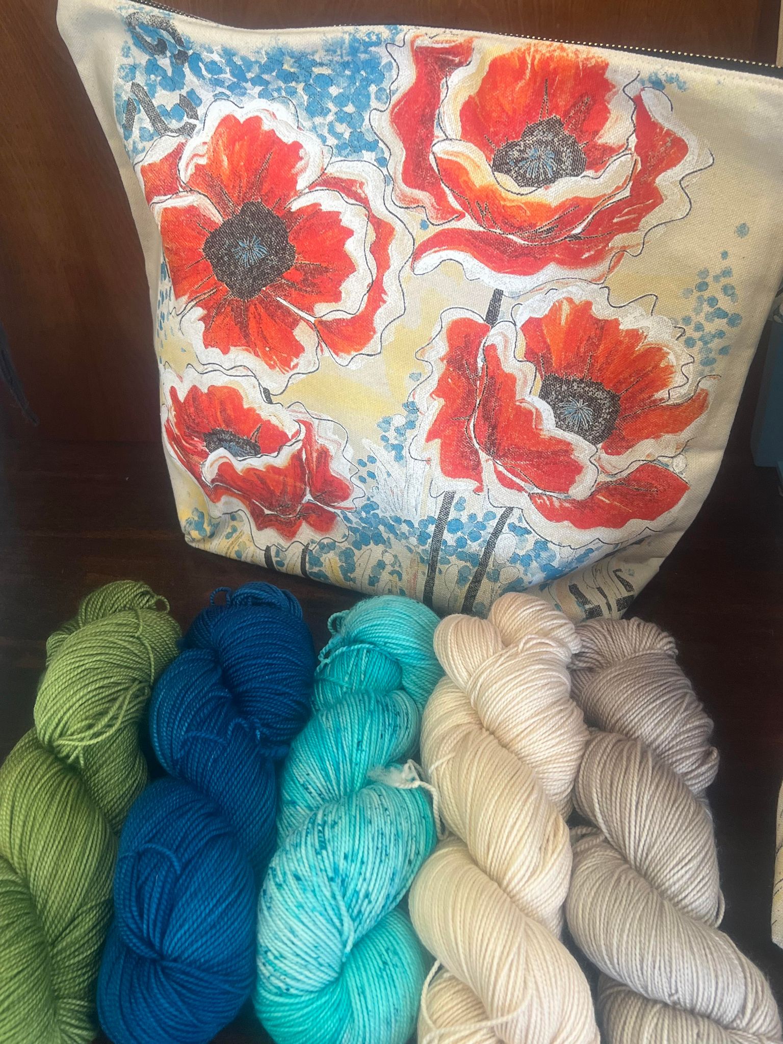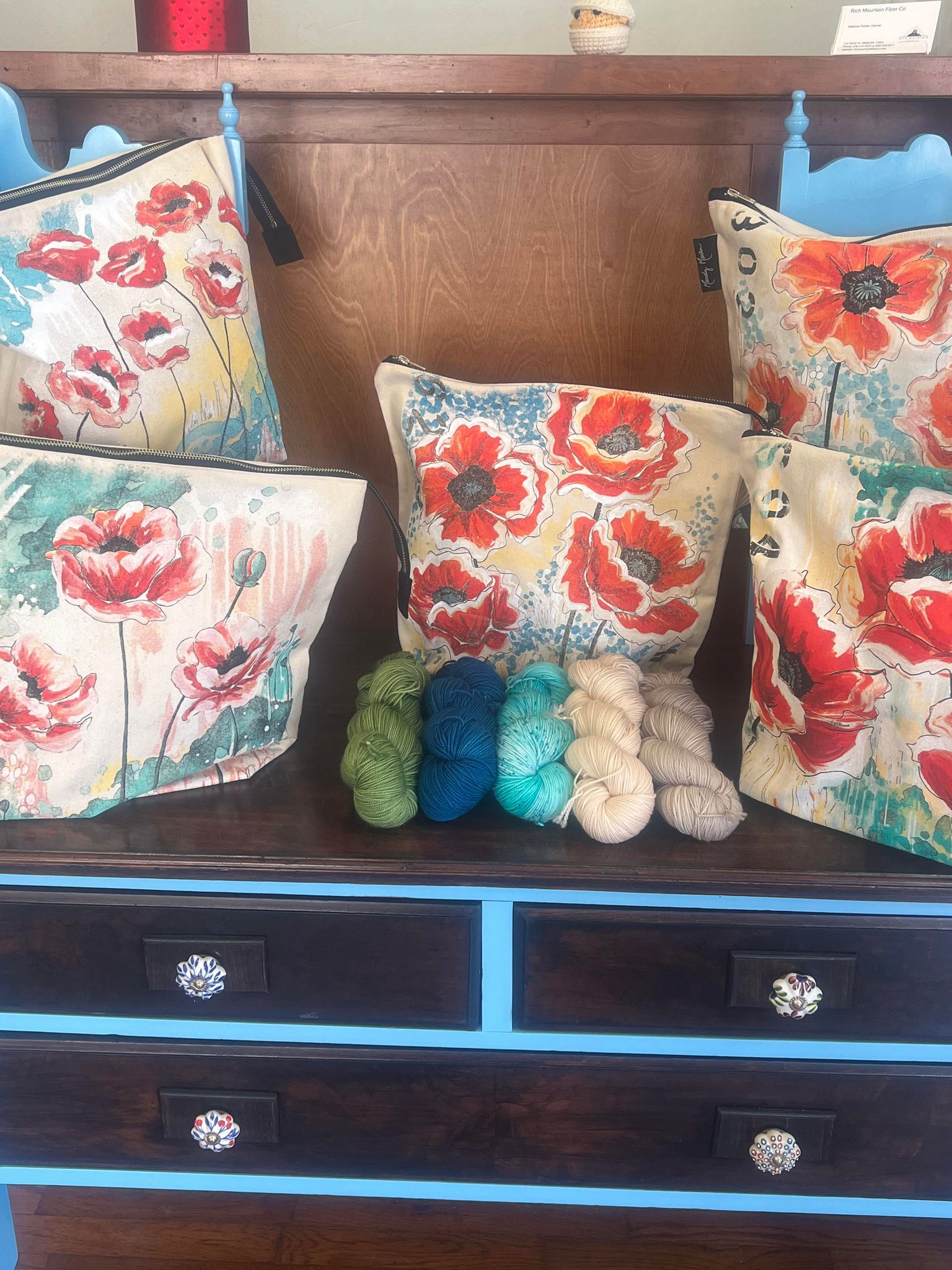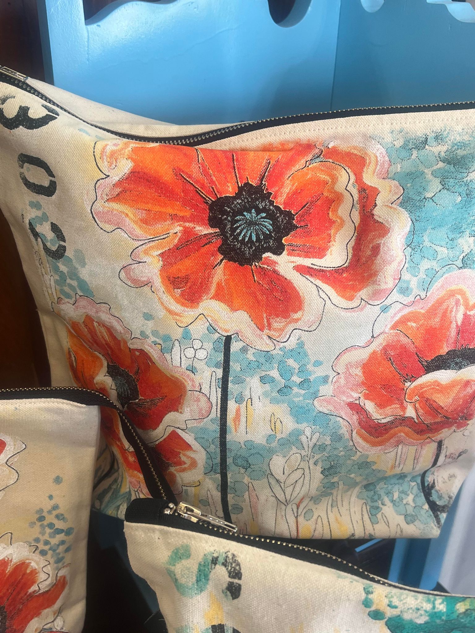 Enjoy original artwork by Mandy Martin with this screen printed cotton canvas project bag or small pouch. Designed with a large size and zippered top, this canvas pouch is perfect for all of your travel essentials, makeup, knitting and crochet supplies, an ipad and notebook, and more!
