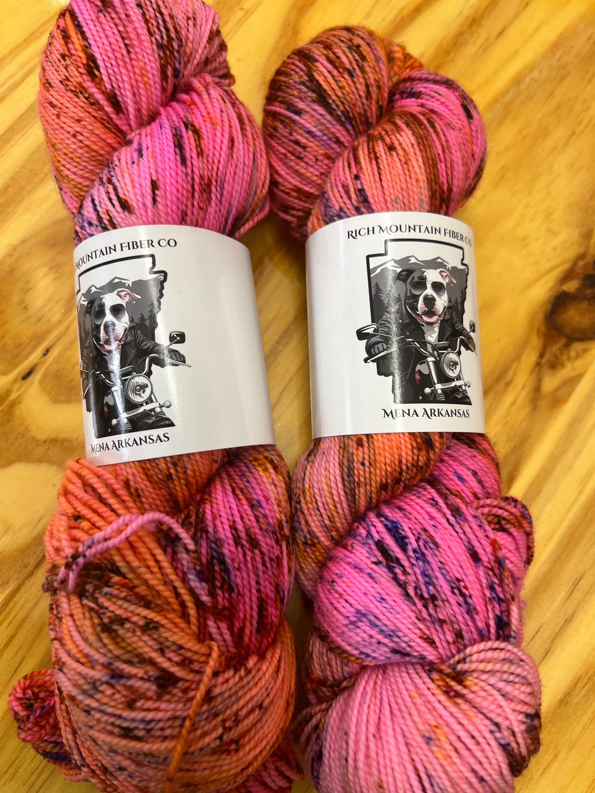 Rich Mountain Fiber Co's in-house hand-dyed HT Fingering yarn is crafted in Mena, Arkansas.
